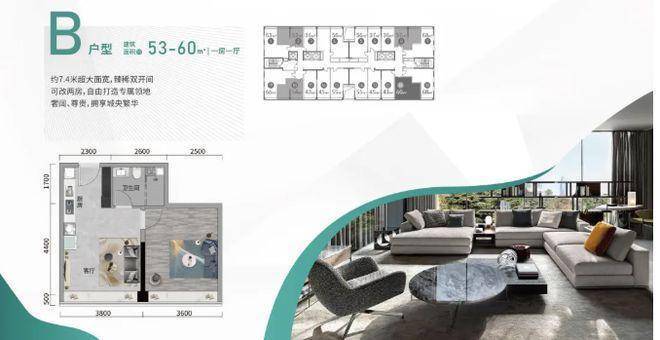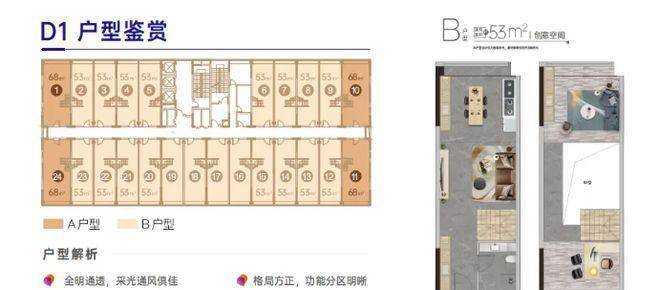 户型设计亮点满满,得房率超高。53 - 68㎡全能空间,4.5 米中空挑高,空间奢阔且百变,能根据不同需求进行改造,实用率超 150 + %,投资价值高。35 - 68㎡冠军居所,超低总价,不限购不限贷,无论是单身人士自住,还是投资者入手,都很合适。每个户型都充分考虑了空间利用和市场需求。