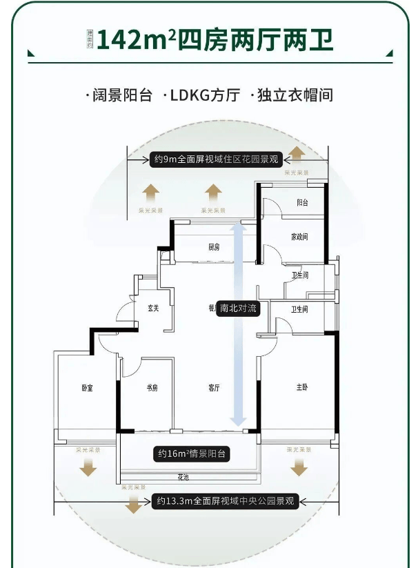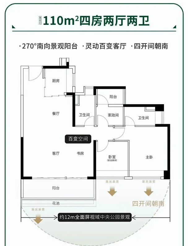 大学城和樾府提供从110平方米到175平方米不等的户型选择,满足不同家庭的需求。其中,建面110平方米的三房两卫户型拥有12米的采光面和270度南向景观阳台,为住户带来充足的自然光线;而建面175平方米的四房三卫则配备了LDKG大通厅设计,面积达到约64平方米,并享有29米的一线公园景观面,完美融合了空间感与自然美景。