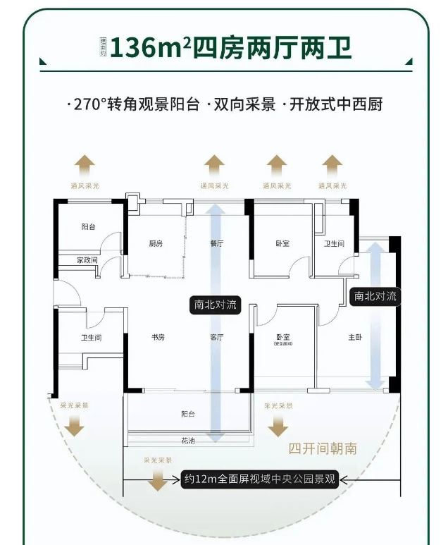大学城和樾府的户型设计充分考虑到了现代家庭的需求。以136平方米四房两卫为例,其四开间朝南的设计使得室内阳光充足,南北对流的布局也保证了空气流通。而142平方米的四房两卫,则采用了LDK餐客厅一体化设计,加上南北对流的主卧,营造出温馨的家庭氛围。