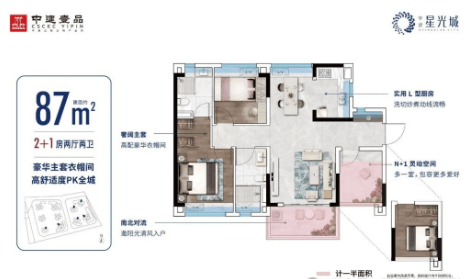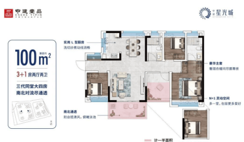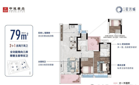 中建·星光城提供多种户型选择,包括约69-100平方米的三房至四房单位,所有户型均为南向布局,空间利用率高达94%,保证了良好的采光和通风效果。特别是建面约91平方米的南北通透四房户型,宽敞明亮,适合大家庭居住。
