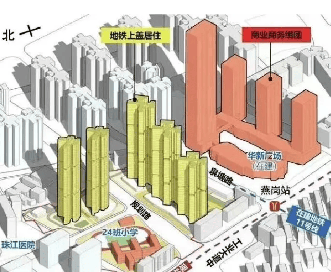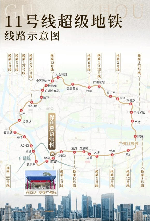 保利燕语堂悦就在海珠区工业大道中燕岗地铁站旁,真真正正的地铁上盖项目。从百度测量的数据看,离地铁站不到二百米。燕岗地铁站是广佛线跟 11 号线大环线的交汇点,对于在珠金琶上班的朋友来说,简直太友好。坐 11 号线环线,8 站就能到琶洲;通过广佛线换乘 3 号线,7 个站就到珠城。