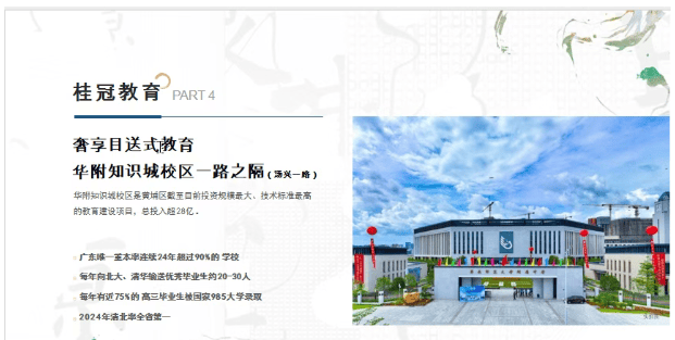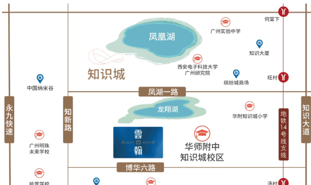 广开云翰一路之隔即为华附知识城校区,直线距离仅100米。该校为黄埔区截至目前投资规模最大、技术标准最高的学校之一,于2023年开始招生。初中部采取自主招生+全区摇号的方式,业主子女有机会入读这所优质学府。此外,周边还有华附知识城小学、广东外语外贸大学知识城实验小学、凤凰湖小学、广州实验中学及小学、新侨中学等多所学校,教育资源丰富。