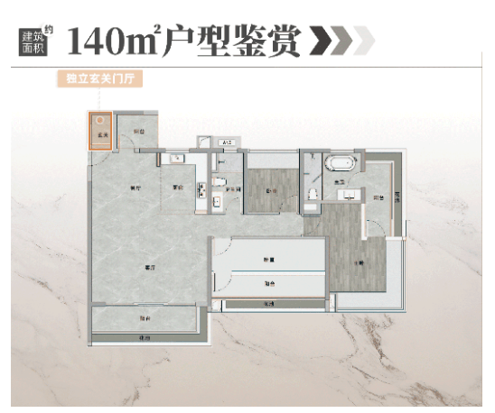 6. 建面约140㎡四房:高端改善户型,同样位于高区,配置独立玄关库、U型全能厨房,细节设计满分,甚至为婴儿车、滑板车预留了专属收纳位,空间布局合理,动静分离,采光与通风效果极佳,能够满足高端改善群体的居住需求,彰显居住品质。