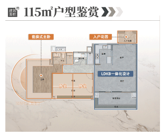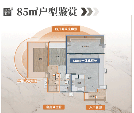 2. 建面约85㎡三房:刚改优选户型,带入户花园,户型方正通透,南向超大面宽,赠送面积最多,使用率接近120%,空间布局合理,动静分离,能够满足三口之家的居住需求,同时入户花园可作为储物、休闲等多功能使用,提升空间利用率。