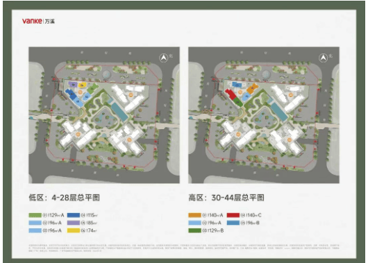 【总层-梯户比】:项目楼栋分为高低区设计,4-28层为低区,采用2梯6户布局;30-44层为高区,采用2梯5户布局,高低区分区管理,保障业主出行便捷性与居住私密性。