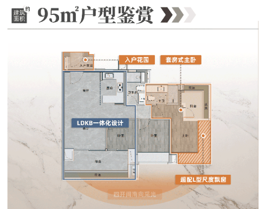 3. 建面约95㎡三房:舒适三房户型,带入户花园,户型做到了严格的动静分离,全屋采光面近19米,采光与通风效果极佳,空间宽敞舒适,能够满足三口之家的舒适居住需求,同时预留了一定的拓展空间,可根据家庭需求灵活改造。