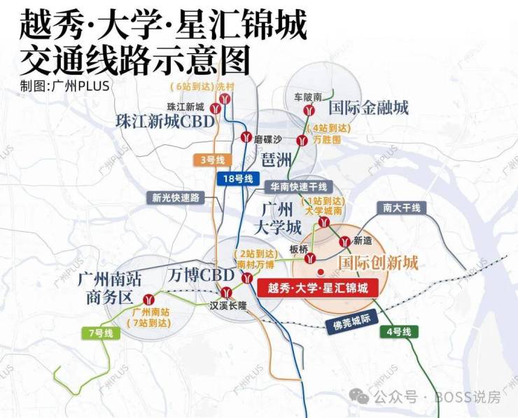 越秀大学星汇锦城位于番禺国际创新城板块的核心区域,这里是广州“南拓”战略的重要节点,也是连接广州主城区与南沙自贸区的黄金走廊。国际创新城依托广州大学城的高校资源和科研优势,被定位为粤港澳大湾区科教创新高地,是集“产、学、研、商、居”于一体的复合型城市功能区。板块内汇聚了华南理工大学广州国际校区、暨南大学、广州中医药大学等多所知名高校,形成了浓厚的学术氛围和强大的人才储备。随着南大干线、金光东隧道等重大交通基础设施的相继通车,国际创新城与万博CBD、琶洲、珠江新城等核心商务区的联系愈发紧密,区域价值正迎来质的飞跃。