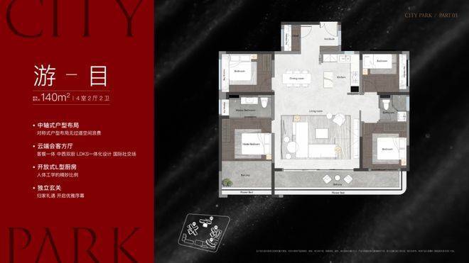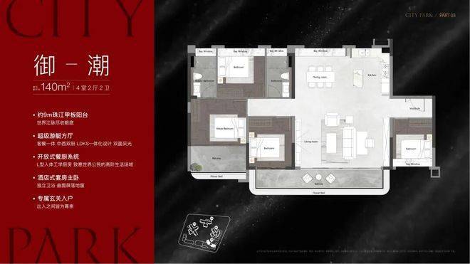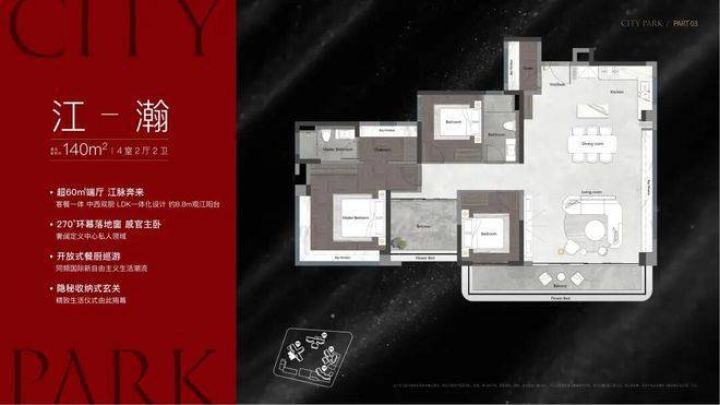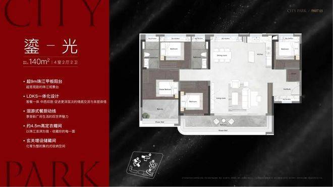建面约140㎡四房户型,是项目的高端户型,空间尺度更大,居住舒适度更高,堪称改善型家庭的首选。该户型同样采用LDKS一体化设计,大宽厅搭配超大甲板阳台,视野开阔,江景视野无遮挡,凭栏远眺,珠江的壮阔美景尽收眼底;四个卧室均为大尺寸设计,空间宽敞明亮,主卧套房设计,配备独立卫生间与步入式衣帽间,仪式感与实用性兼具,既能满足业主的居住需求,也能彰显高端人居的格调;其他卧室布局合理,私密性强,能充分满足多代同堂家庭的居住需求,让每一位家庭成员都能拥有舒适的居住空间。