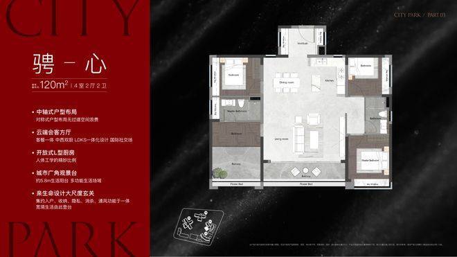 建面约120㎡四房户型,是项目的经典户型之一,空间布局紧凑合理,无任何空间浪费,使用率高达96%,既能满足多孩家庭的居住需求,也能兼顾长辈同住的私密性。户型南北通透,采光通风效果极佳,客厅连接甲板阳台,南向瞰江视野,让业主在客厅就能欣赏到珠江盛景;四个卧室布局合理,空间充足,均配备飘窗,增加了空间的使用面积,也提升了居住的舒适度,主卧套房设计,配备独立卫生间,私密性强,让业主能享受专属的静谧空间。