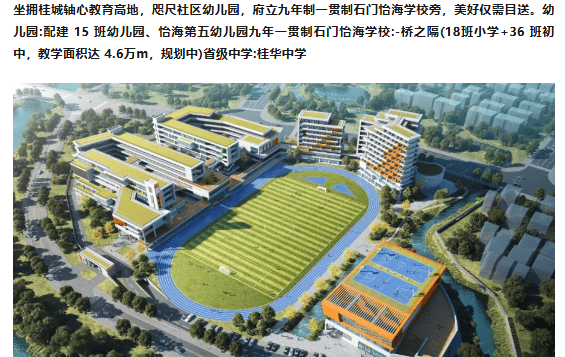 教育方面,自带15班公立幼儿园,临近规划九年一贯制石门怡海学校,周边有成熟公办中小学资源,教育体系完善;商业方面,基础便民商业齐全,大型商业体车程10分钟内可达,可满足全维度消费需求;交通方面,临近多条已通车及规划地铁线路,现阶段以自驾通勤为主,公交覆盖基础出行,轨道交通后续将逐步完善。