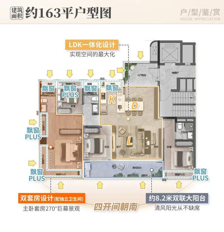 保利和著作为佛山和字系 2.0 升级之作,户型产品力升级,使用率最高达 91%,高于市面上主流户型平均使用率。119㎡户型拥有长达 9.4 米的整面墙收纳设计,提升空间利用率,且客厅连通超 6.4 米南向阳台,奢阔感十足。129㎡户型为千灯湖臻稀南向四开间。143㎡户型带来总统套房轻奢体验。163㎡户型配备约 8.8㎡超大入户花园,开间约 3.55 米,可灵活打造多种功能区。客厅与多功能房相连形成洄游动线,南向跑道式阳台实用性强,是具有 “成长性” 的户型。