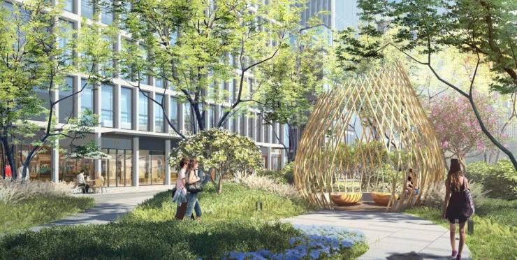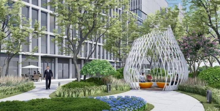 中国美都采用了Low-e玻璃幕墙设计,这种材料不仅让建筑物看起来更加现代、美观,同时也提供了360°开阔视野。整个园区以“中轴景观、组团景观、庭院景观”三重生态空间为特色,打造了一个开放式原生态庭院办公环境,使员工在忙碌的工作之余也能享受到自然的美好。