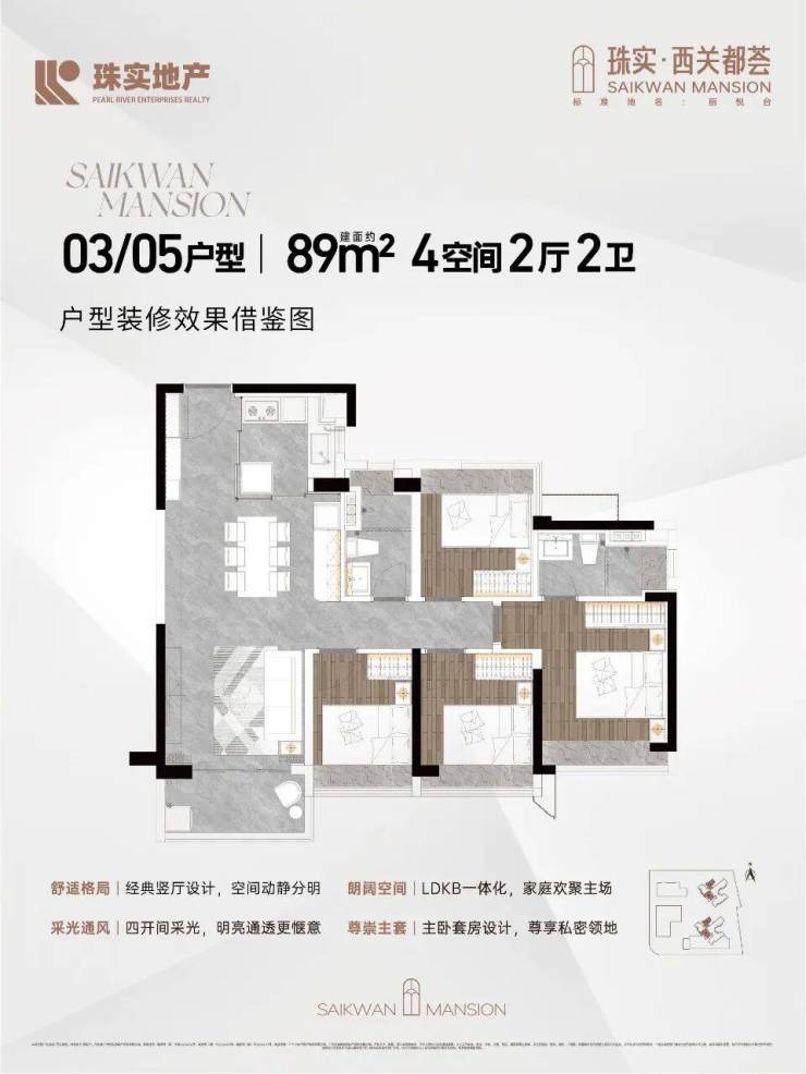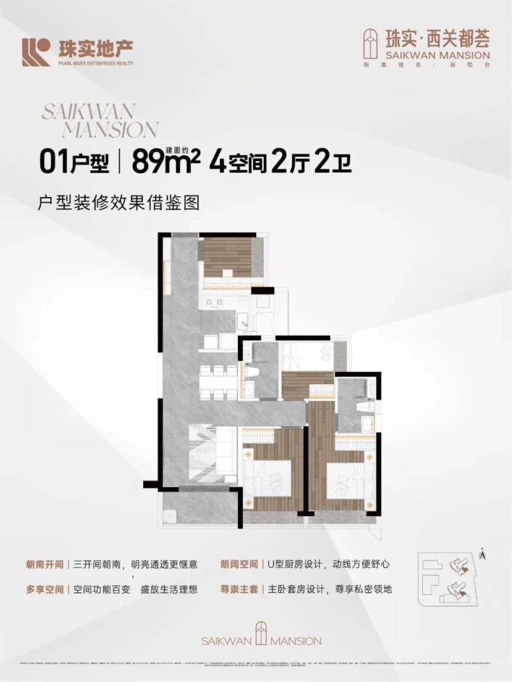 户型设计独具匠心。即将推出的 2 栋臻品有着使用率更高、飘窗面积更大的新规高标特点。主力户型为建面约 89 - 142㎡的四至五空间,是西关唯一 100% 纯四房起步社区、唯一 100% 使用率户型、100% N + 1 房设计。100% 四房起步,在整个荔湾都不多见,精准定位改善型住户,提高社区圈层纯度。100% 使用率意味着同等建面下,能为业主提供更多使用面积,从而实现 100% N + 1 房设计,满足家庭不同阶段的空间需求。全屋品牌精装交标,还送洗碗机、全屋中央空调、智能家电系统等,加配珠实 7 大品质人居系统,从门窗隔音隔热到前端净水器、卧室安防等,全方位提升居住品质。而且提供 1 户 1 设计的大师高定服务,即 “共创式” 交标,为每户量身定制交标,预留多功能空间,可灵动定制 4 空间或 5 空间,满足全周期家庭居住需求,节省业主改造的金钱与精力。