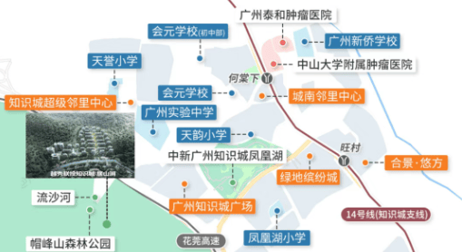 项目所在板块为知识城发展最早、配套最成熟的区域之一,距地铁14号线何棠下站约2公里,自驾通过花莞高速、知识大道等主干道,约30分钟可达珠江新城。未来规划中的8条轨道(含37号线、新白广城际等)、5条高速与7条快速路,将进一步强化其湾区“1小时生活圈”地位。作为粤港澳大湾区广深科技创新走廊的“北极点”,知识城已聚集超1700家知识型创新企业、13所国际高校,区域价值持续跃升。