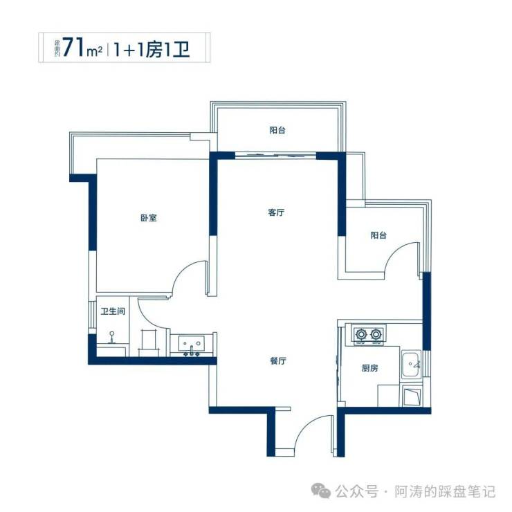 LDKB一体化:客厅、餐厅、厨房、阳台一体化设计,空间利用率极高。
