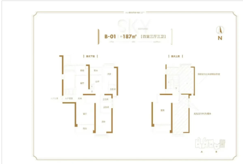 世茂天越主力户型为建面约 238-264㎡天际复式江景住宅,梯户比为两梯两户,得房率远超同板块同类产品,空间利用率极高。户型设计灵活多变,最多可做 5 房,可根据家庭需求定制化设计,满足三代同堂、多孩家庭等不同居住需求。