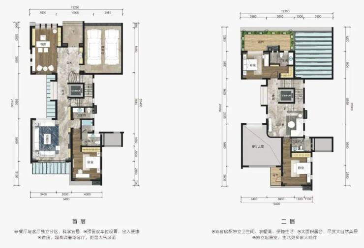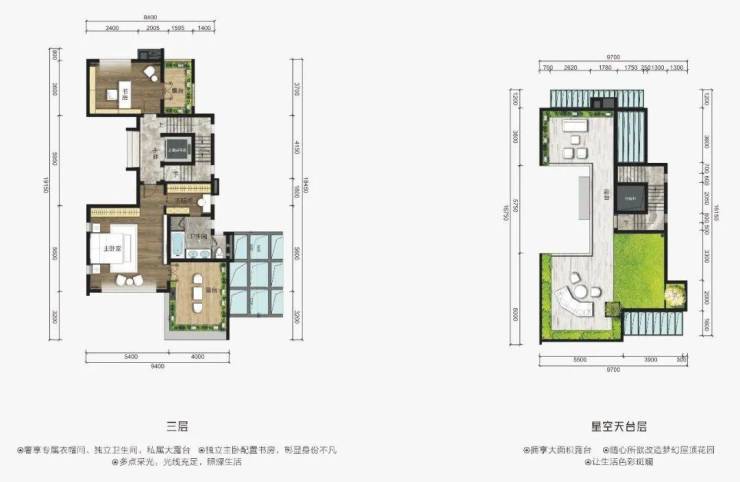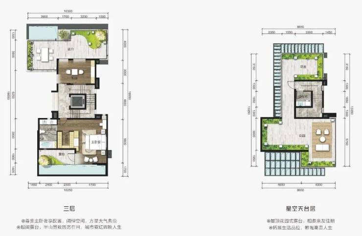 每一栋皆有前庭后院、室内预留电梯空间、双层休闲会客厅、双主卧套间设计,顶层更有星空大露台,极致追求高质量的品质生活。