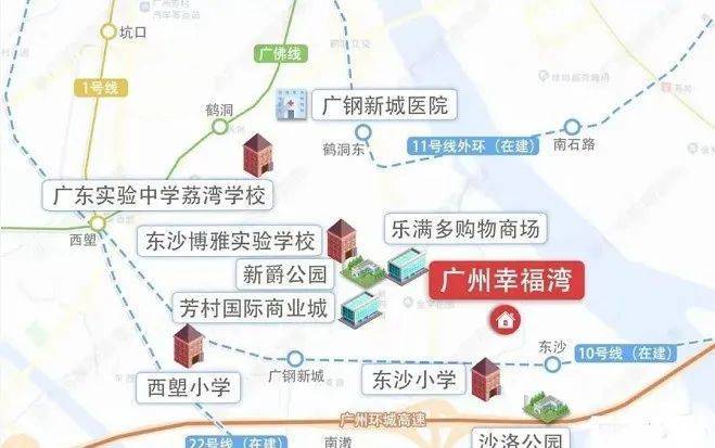 地铁:项目目前距离1号线西塱站大约3.5公里,未来将有10、11、22号线(在建中)三地铁交汇,其中距离10号线东沙站仅约600米(预计2024年底开通),便捷连接天河、白云、越秀、荔湾和海珠区。