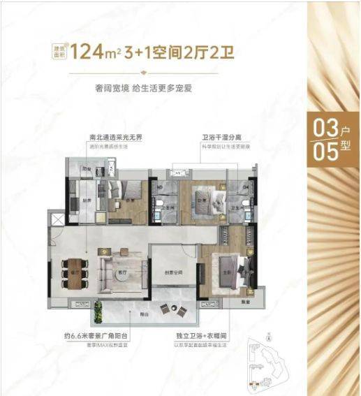 90%以上户型为纯南向板楼设计,南北通透,客厅、卧室及餐厅动线合理。主力户型88-122平方米三至四房设计,大面宽短进深,空间利用率高,部分户型配置观景阳台、步入式衣帽间,满足家庭日常生活及收纳需求。