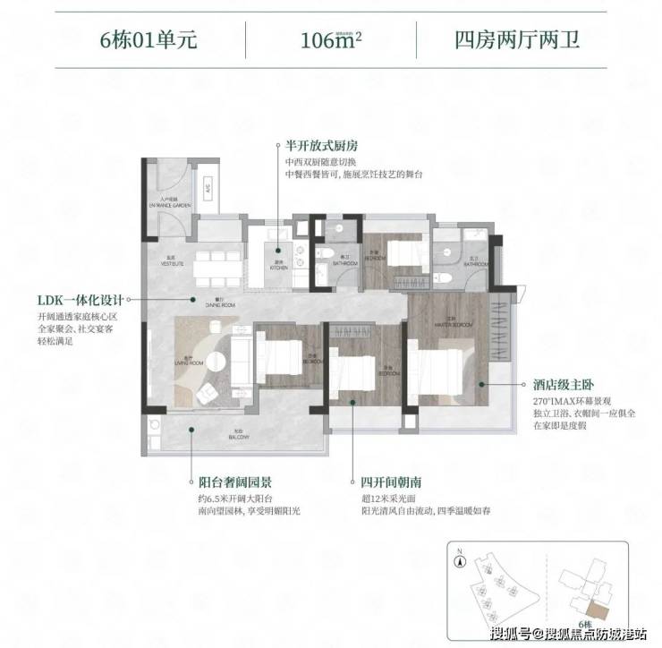 106㎡四房:LDKB一体化布局,270°环幕阳台直面珠江景观;