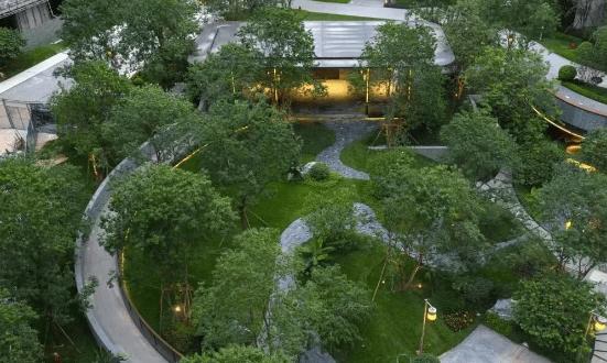 傍晚18:00:和家人在社区园林中散步,园林景观设计精美,四季有花,四季有景。