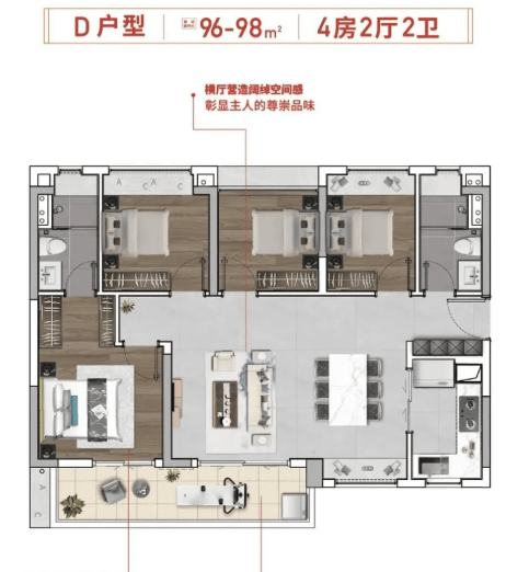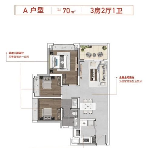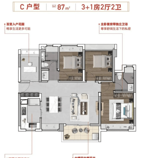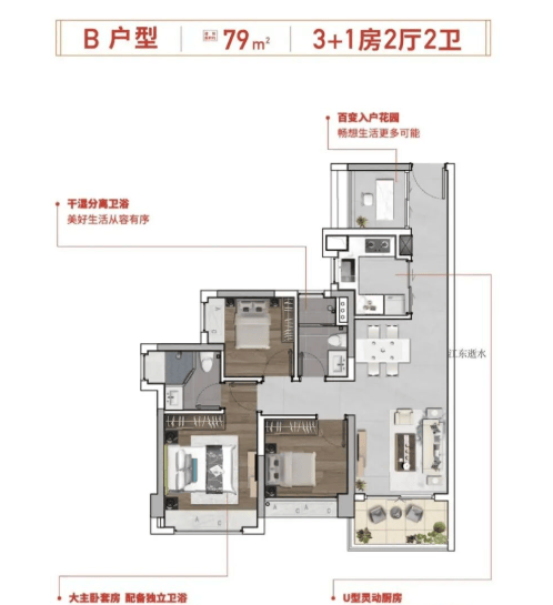 项目目前主推四种户型:70㎡三房一卫、79㎡三房二卫、87㎡四房二卫及98㎡四房二卫。其中,79㎡户型已实现主卧套房设计,87㎡做到四房带主套,空间使用率高,功能布局紧凑合理。所有户型均为精装交付,契合刚需及刚改家庭对“一步到位”的需求。尽管面积段偏小,但在同区域产品中具备较强竞争力,尤其适合年轻家庭、高校教职工或健康产业从业者安家置业。
