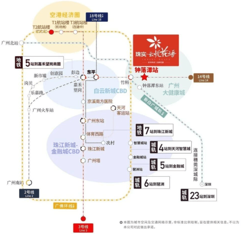 项目交通网络日益完善。地铁方面,距14号线钟落潭站A出口约800米,5站可达嘉禾望岗,换乘2、3号线直通白云新城及广州全城;14号线二期在建,未来将不换乘直达广州火车站;18号线北延段(在建)将在白云东平站与14号线交汇,7站抵达冼村;竹料站可换乘广佛环线(预计2024年通车),3站达天河智慧城,5站到琶洲;新白广城轨(在建)1站即达白云机场,并南向连接东莞、深圳。自驾方面,华南快速、京港澳高速、机场第二高速、花莞高速、广从公路环绕,畅达大湾区核心城市。