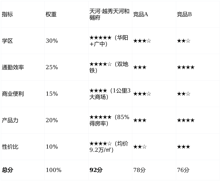 结论:项目综合得分远超竞品,尤其在学区和产品力上形成“降维打击”。