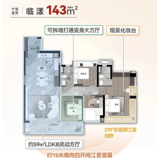 【建面约143㎡四房两厅两卫(“临漾”户型)】南向四开间设计,南向采光面达15米,配备约7.8米景观阳台,视野开阔无遮挡,10楼以上户型可享无遮挡江景。约59㎡LDK大客厅与灵动空间打通,空间尺度阔绰,适合家庭社交与日常活动;主卧配备独立卫浴,保障居住私密性,空间布局明亮开阔,满足大家庭对功能分区与舒适度的高标准诉求。