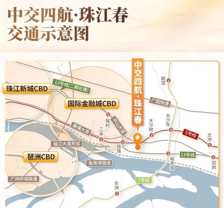 地铁出行方面,项目周边环绕地铁5号线、13号线二期(在建,2025年通车)两条线路,距离5号线鱼珠站约1公里,步行13分钟可达,也可通过电瓶接驳车快速抵达地铁站。乘坐5号线1站直达金融城,0换乘可达珠江新城,5分钟直达金融城核心区,20分钟通达珠江新城,便捷链接天河核心商圈;13号线二期通车后,将进一步提升通勤效率,直达天河公园、新塘等区域。