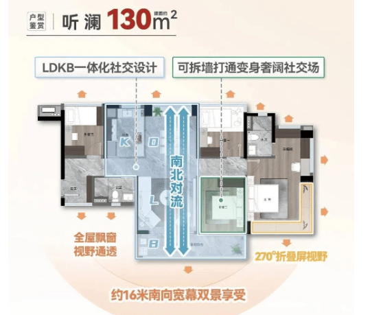 【建面约130㎡四房两厅两卫】该户型分为“听澜”“阅涛”两个版本,采用飞机户型设计,四开间朝南,南向采光面达15-16米,全屋采光充足、南北对流。配备独立玄关,提升空间隐私性与收纳能力;LDKB一体化设计,打破客厅、餐厅、厨房、阳台的空间壁垒,形成约36㎡无界厅空间,适合多代同堂居住。其中“阅涛”户型配备270°宽景阳台,主卧为270°江景主卧,推窗即可俯瞰珠江壮阔景致,6.9米“跑步式阳台”进一步拓展景观视野,日常晾晒与休闲观景两不误。