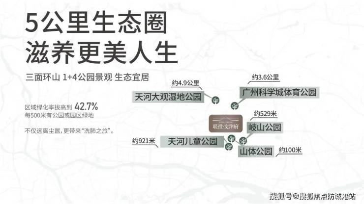 项目以2.73容积率打造7栋纯改善社区,远低于天河区平均5.0的容积率。实测楼间距达60米,户户南向,无对望、无遮挡,视野开阔。小区内拥有“三面环山”的自然景观,人均公共绿地面积达13.4㎡,负氧离子浓度3200个/cm³,是珠江新城核心区的44倍。外揽“1+4公园”(山体公园、天河区儿童公园等),内建“一轴两心三节点六境园韵”低密园林,实测绿化覆盖率达42.7%。