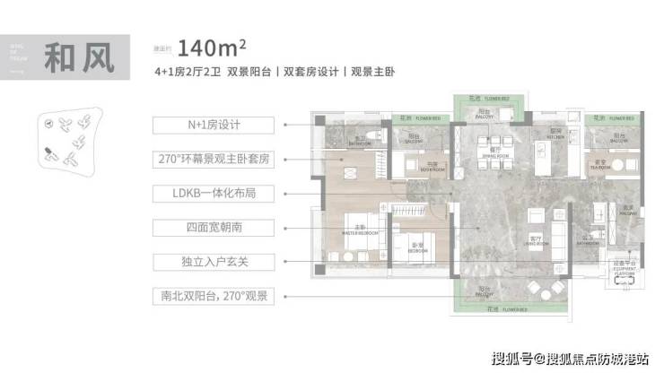 140㎡4+1房:15.7米南向采光面,南北双阳台,270°折叠屏飘窗,9米L型景观阳台;