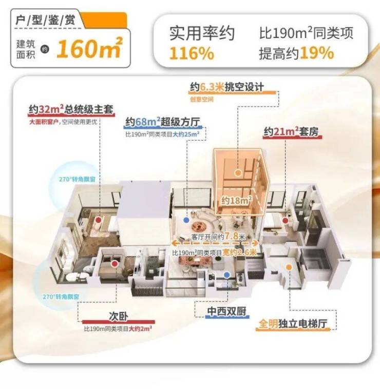 166㎡顶奢户型:仅90套,四开间朝南,双主卧套房设计,空间利用率高达98%;
