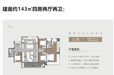 建面约143平方米的四房两厅两卫户型,则是终极改善的首选。超大尺度的客厅和餐厅,搭配全景落地窗,将室外的风景尽收眼底,视野极其开阔。主卧套房面积宽敞,配备步入式衣帽间和豪华卫浴,尽显奢华品味。双阳台设计,分别位于客厅和主卧,既满足了晾晒需求,又增加了休闲空间。该户型的得房率同样惊人,使得每个房间都显得气派非凡,足以承载高端家庭的品质生活需求。