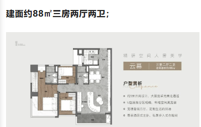 以建面约88平方米的三房两厅两卫为例,该户型在有限的面积内实现了功能的最大化。客厅与餐厅南北通透,采光通风极佳,空间开阔大气。主卧套房设计,配备独立卫生间,保障了主人的私密性。次卧和书房布局合理,动静分区明确,既满足了家庭成员的独立空间需求,又兼顾了整体的和谐统一。这种紧凑而不失精致的户型设计,非常适合年轻刚需家庭或三口之家。