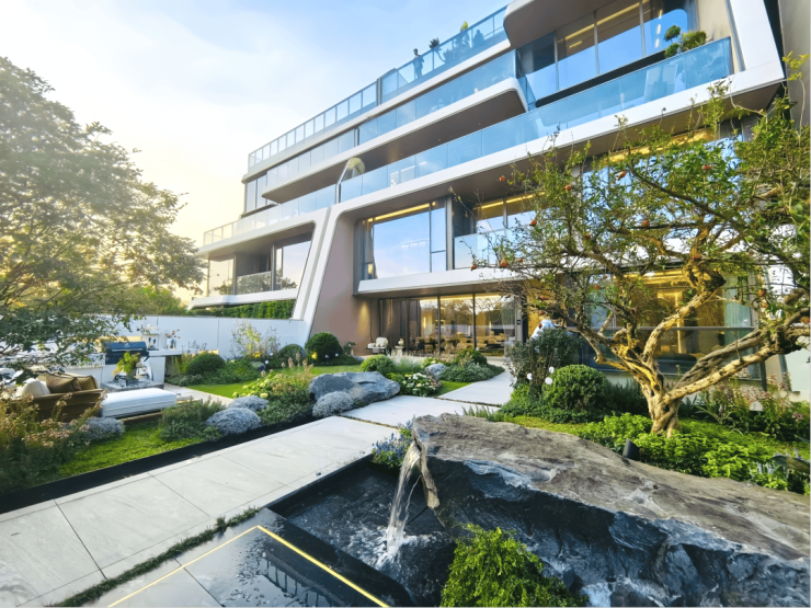 项目私享太阳湖、月亮湖双湖景观,实测湖岸线长度达1.9公里,负氧离子浓度达3040个/立方厘米,是珠江新城的44倍。台地式设计使楼栋与湖面高差达8米,确保每户视野无遮挡。以252㎡湖景1号楼为例,客厅观景面宽达12米,270°环幕落地窗将湖景引入室内。