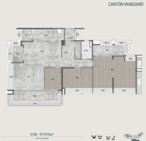 最后是建面约195㎡的四空间两厅三卫户型,名为江幕,这个户型是项目的高端大平层户型,定位为江景豪宅,能满足高端改善群体的居住需求。该户型的设计更加注重舒适度和私密性,空间开阔大气,布局合理,每一个细节都透露着高端与精致。超大的瞰江阳台,能让业主全方位欣赏到珠江的壮美景色,270°的观景视野,将江景尽收眼底;多套房设计,配备独立的卫生间和衣帽间,能满足家庭成员的个性化需求,同时也能彰显主人的尊崇身份;一体化的客厅和餐厅,空间开阔,适合举办高端聚会和商务宴请,让业主在自家就能享受高端的社交体验。