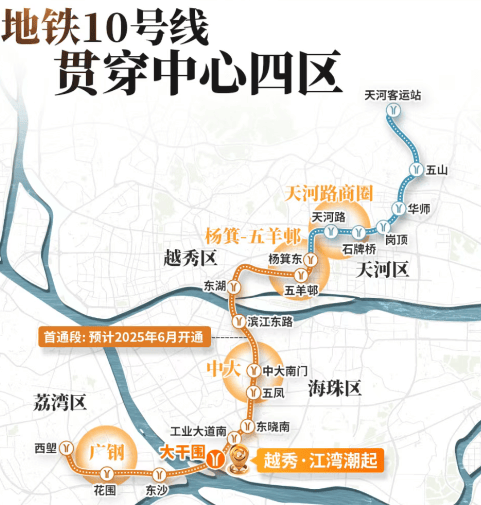 目前10号线大干围站已经开通,预计2026年全线通车,全线通车后,从大干围站出发,4站可到达中大,9站可直达珠江新城,这个线路规划是经过官方确认的,真实可靠。10号线作为广州地铁的重要线路,串联起天河、越秀、海珠等多个区域,通车后,将极大地提升项目的交通便捷度,业主通勤到天河CBD会非常方便。