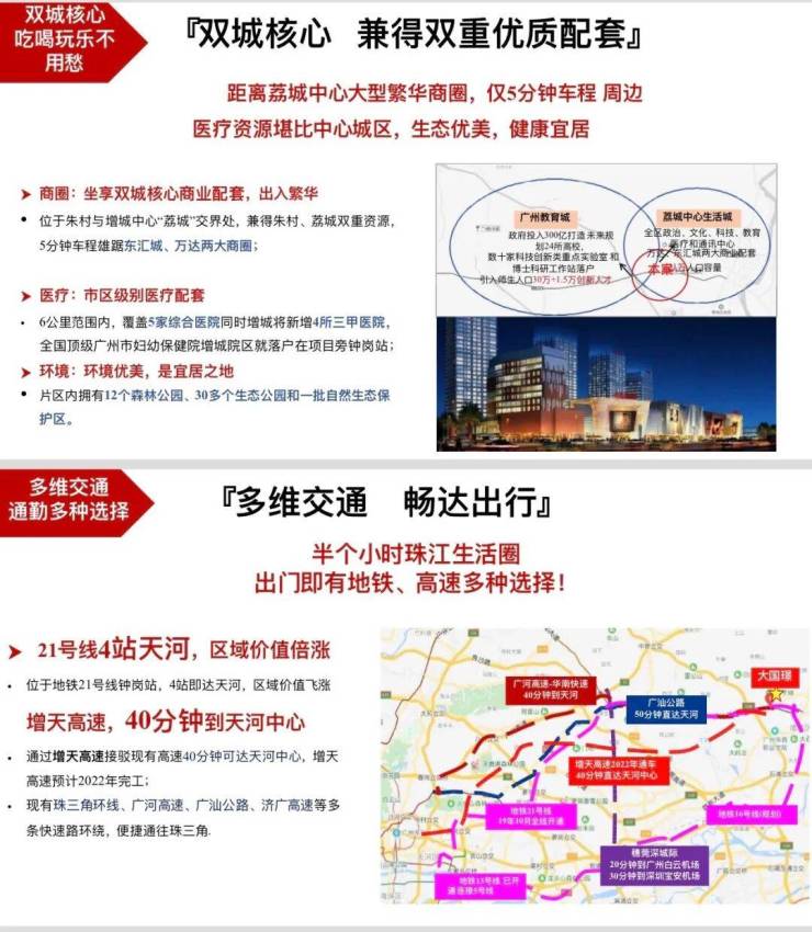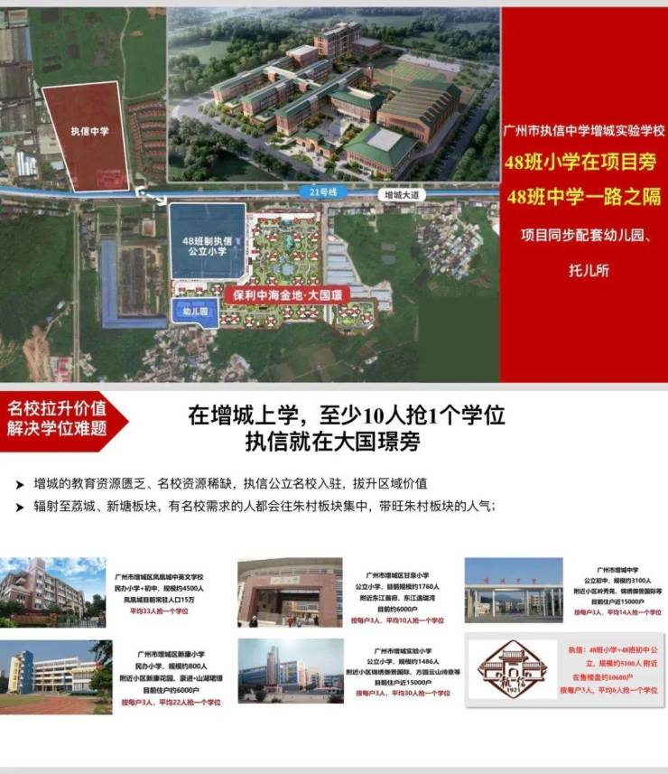 保利中海金地大国璟项目刚好处于增城科教城板块与增城市区荔城板块的核心位置,向东5分钟车程内可到增城市区——荔城,这里有增城万达广场、东汇城、增城公园、增城博物馆、图书馆、银行、增城中学等城市等配套聚集,生活氛围较成熟;向西拥有总投资1800亿元的广州科教城的发展红利,将引入数十家科技创新类公司及13所专业学院,可以预测到随着未来科教城高新人口的涌入,这里将会带来大量的置业及居住需求。