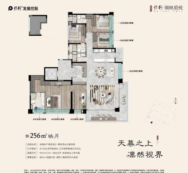 《映月》建面约 256㎡,专梯专户的设计,私密感更强,为业主打造专属的私密天地。270° 奢阔采光阳台,使室内拥有充足的采光,同时提供了无与伦比的观景视野。无论是白天欣赏湖光山色,还是夜晚仰望星空明月,都能在家中轻松实现。