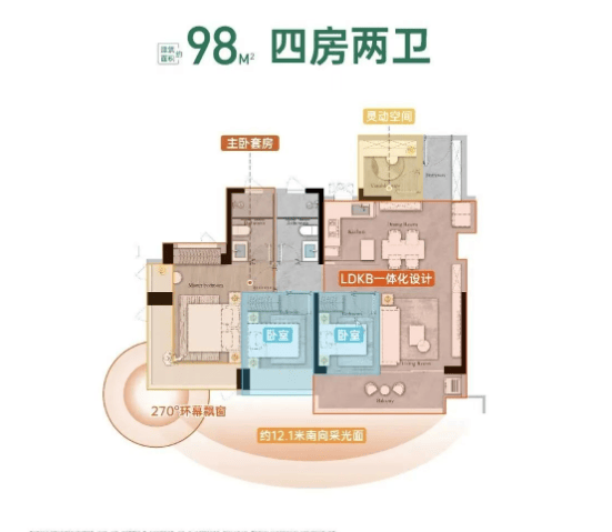 约98㎡四房两卫户型:该户型在88㎡户型的基础上进一步提升了空间利用率,实现了四房设计,适合二胎家庭或三代同堂居住。户型南北通透,客厅开间达4.2米,搭配全景阳台,视野开阔,采光充足。四个房间均方正实用,空间大小适中,不会给人压抑感;主卧套间配备独立卫浴和大尺度衣帽间,提升了居住的奢华感;公共卫生间采用干湿分离设计,避免了潮湿问题,使用更方便。厨房与餐厅紧密相连,用餐动线合理,同时餐厅可直接通往生活阳台,方便日常晾晒和储物。