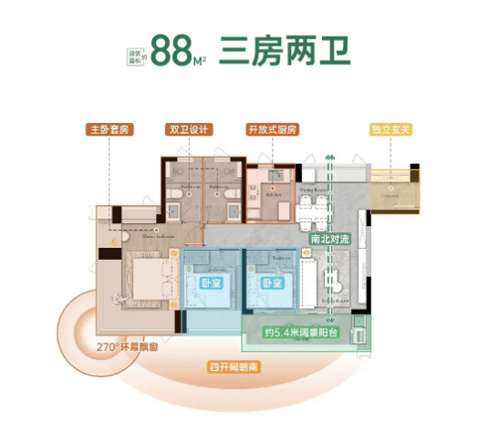 约88㎡三房两卫户型:该户型为刚需首选户型,整体布局方正,南北通透,采光通风效果极佳。客厅连接景观阳台,拓展了室内空间视野,同时让自然光线充分进入室内。主卧为套间设计,配备独立卫生间和衣帽间,保证了业主的私密性和居住舒适度;两个次卧空间宽敞,可根据需求改造成儿童房、书房等,满足家庭不同阶段的使用需求。厨房采用U型设计,操作空间充足,动线合理,方便业主日常烹饪。