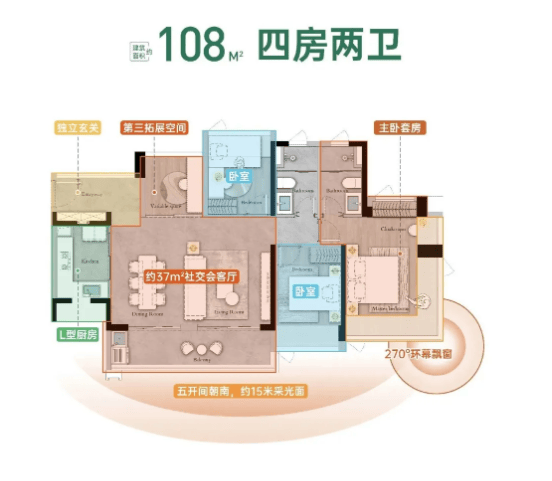 约108㎡四房两卫户型:该户型为项目的改善型主力户型,空间尺度更为宽敞舒适。客厅开间达4.5米,搭配7.2米超长景观阳台,将室外美景尽收眼底,同时为家庭休闲娱乐提供了充足的空间。主卧套间面积超20㎡,配备独立卫浴、衣帽间和观景飘窗,居住体验堪比豪宅;三个次卧空间充足,其中一个次卧可改造成书房或健身室,满足业主多元化的生活需求。厨房采用L型设计,操作流畅,同时配备了生活阳台,方便放置洗衣机和储物。