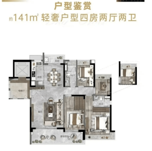 具体户型方面,124㎡户型为三房两厅两卫设计,布局方正,空间利用率高,适合三口之家居住;141㎡户型为四房两厅两卫,南北通透,双阳台设计,满足多人口家庭的居住需求;186㎡大户型为四房两厅三卫,空间宽敞舒适,功能分区明确,配备豪华主卧套间,为业主带来极致的居住体验。