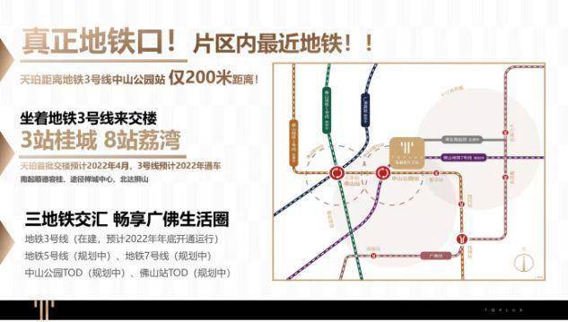 保利时代天珀交通十分便捷,构建了一个立体式的交通网络。双 TOD 规划使项目所在的北门户板块成为市区唯一双 TOD 交汇的黄金地段,未来中山公园站 TOD 及火车站 TOD 两大商圈的发展将极大提升区域的交通枢纽地位和商业活力。地铁 3 号线中山公园站距离项目南侧约 200 米,预计 2022 年通车后,只需 3 站可达桂城,8 站可至广州荔湾,大大缩短了与周边城市核心区域的时空距离,方便居民的日常通勤、商务出行以及休闲旅游。除 3 号线外,未来地铁 5/7 号线的站点也将在此交汇,进一步丰富居民的出行选择,加强与佛山其他区域的联系。规划中的广湛高铁佛山站作为佛山市中心唯一的高铁站,其带来的 “吸虹效应” 将使项目真正融入湾区 1 小时生活圈,为居民的长途出行和区域交流提供便利。此外,随着海五路最后 1km 的建成(预计 2022 年),10 分钟车程即可到达千灯湖,驾车出行可快速连接城市主要干道,方便前往佛山各个区域。
