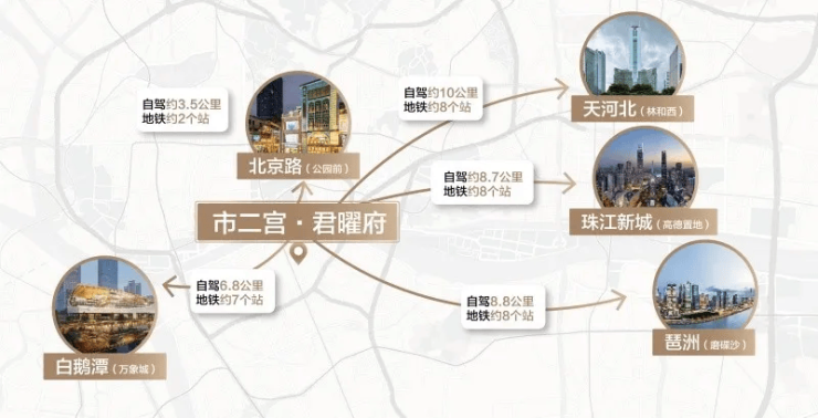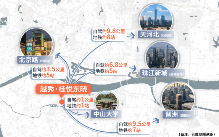 越秀·桂悦东晓落子海珠晓港板块,这里不仅是广府文化的重要发源地之一,更是连接传统老城与新兴CBD的关键节点。项目直线距离珠江新城仅约4公里,一桥之隔即达越秀东山口,对望二沙岛豪宅区,紧邻滨江东高端居住带,堪称“老城黄金三角”的核心交汇点。