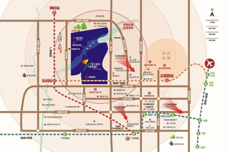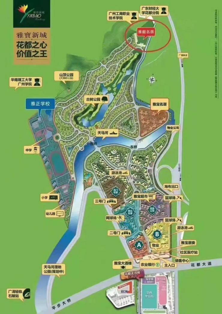 雅宝新城位于广州的花都区,占地100多万平方米,总建筑面积90多万平方米,天马河穿过该项目,紧邻广州新机场快线,小区配有多条专线往返广州、港澳之间。
