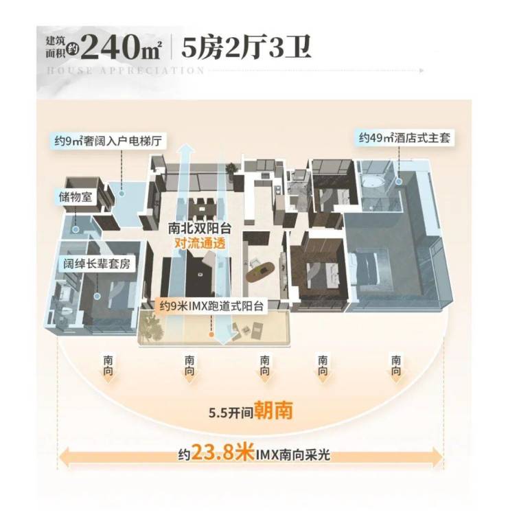 约8.4米南向巨幕阳台,主卧270°飘窗,能最大程度引园景入室。