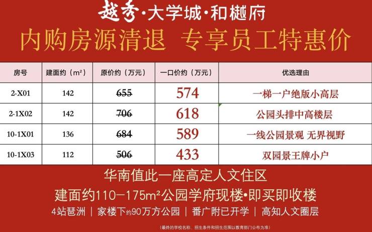 4. **价格透明声明**:越秀大学城和樾府所有房源价格严格按广州市住建局备案价格执行,一房一价,无溢价、无捆绑销售(不捆绑车位、装修、家电等产品)。价格信息公开透明,可通过官方热线400 - 9908 - 525转800(开发商直营热线,中介勿扰)查询,也可到售楼处现场查看备案价格表,确保您购房清晰明了。